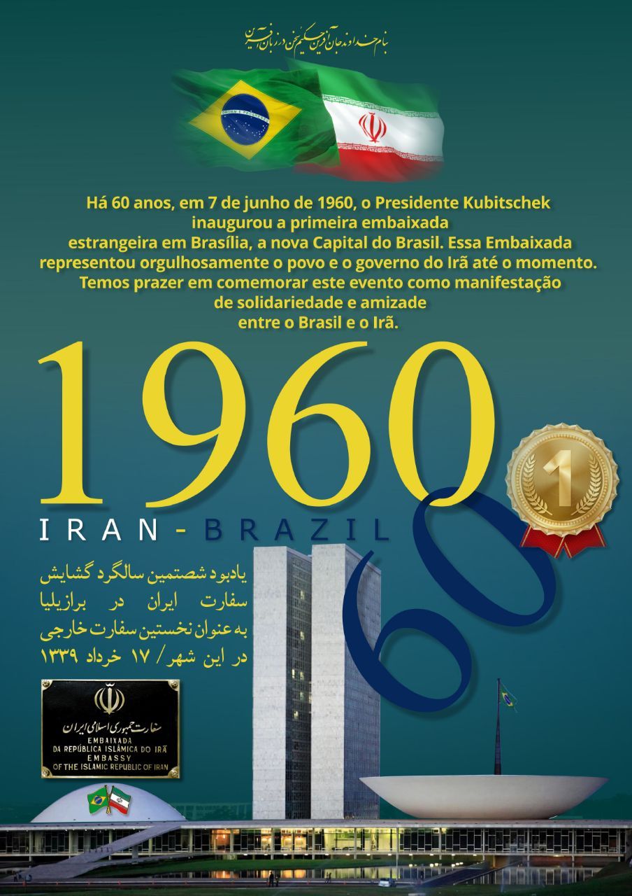Há 60 anos, em 21 de abril de 1960, a nova capital do Brasil era inaugurada, assumindo o posto central das relações políticas nacionais e internacionais. Menos de dois meses depois, em 7 de junho de 1960, o Presidente Juscelino Kubitschek inaugurou a primeira representação diplomática em Brasília, a Chancelaria iraniana, que retratou a confiança do Governo do Irã no projeto desenvolvimentista de Kubitscheck. Naquela oportunidade, declarou o então embaixador iraniano, Marmud Foroughi, “Essa casa é pequena demais para dizer da simpatia que o povo iraniano dedica a este jovem e progressista Brasil”.