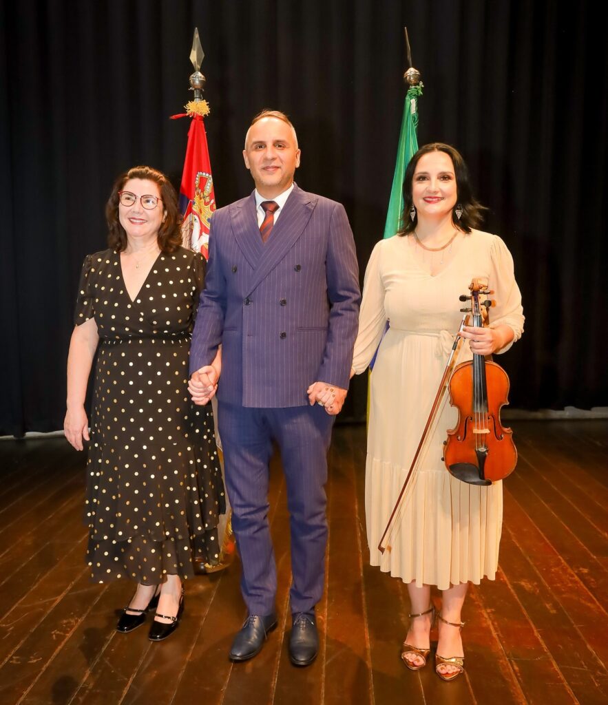 A pianista Júlia Canton, o embaixador Aleksandar Ristik e a violonista Ana Zivkovic