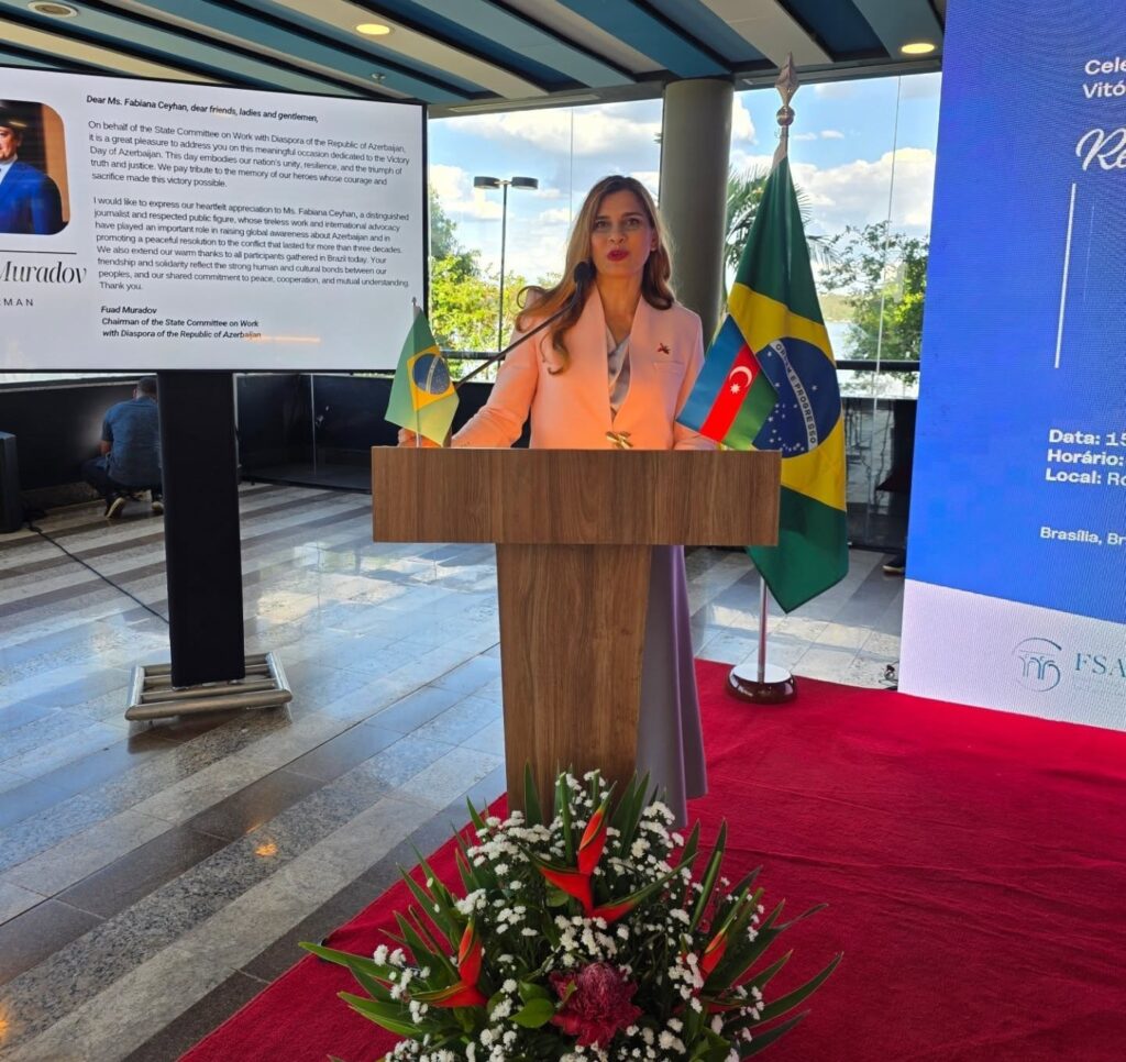 O Comitê da Diáspora do Azerbaijão, organizou em Brasília um evento, no dia 15, no Hotel Royal Tulip, para celebrar o Dia da Vitória com o apoio da jornalista Fabiana Ceyhan. O presidente do Comitê de Trabalho com a Diáspora e ex-presidente do Parlamento, Fuad Muradov, foi representado por Salhat Abassova, chefe do departamento para Américas, Grã-Bretanha e Israel do Comitê, que viajou ao Brasil exclusivamente para a celebração.