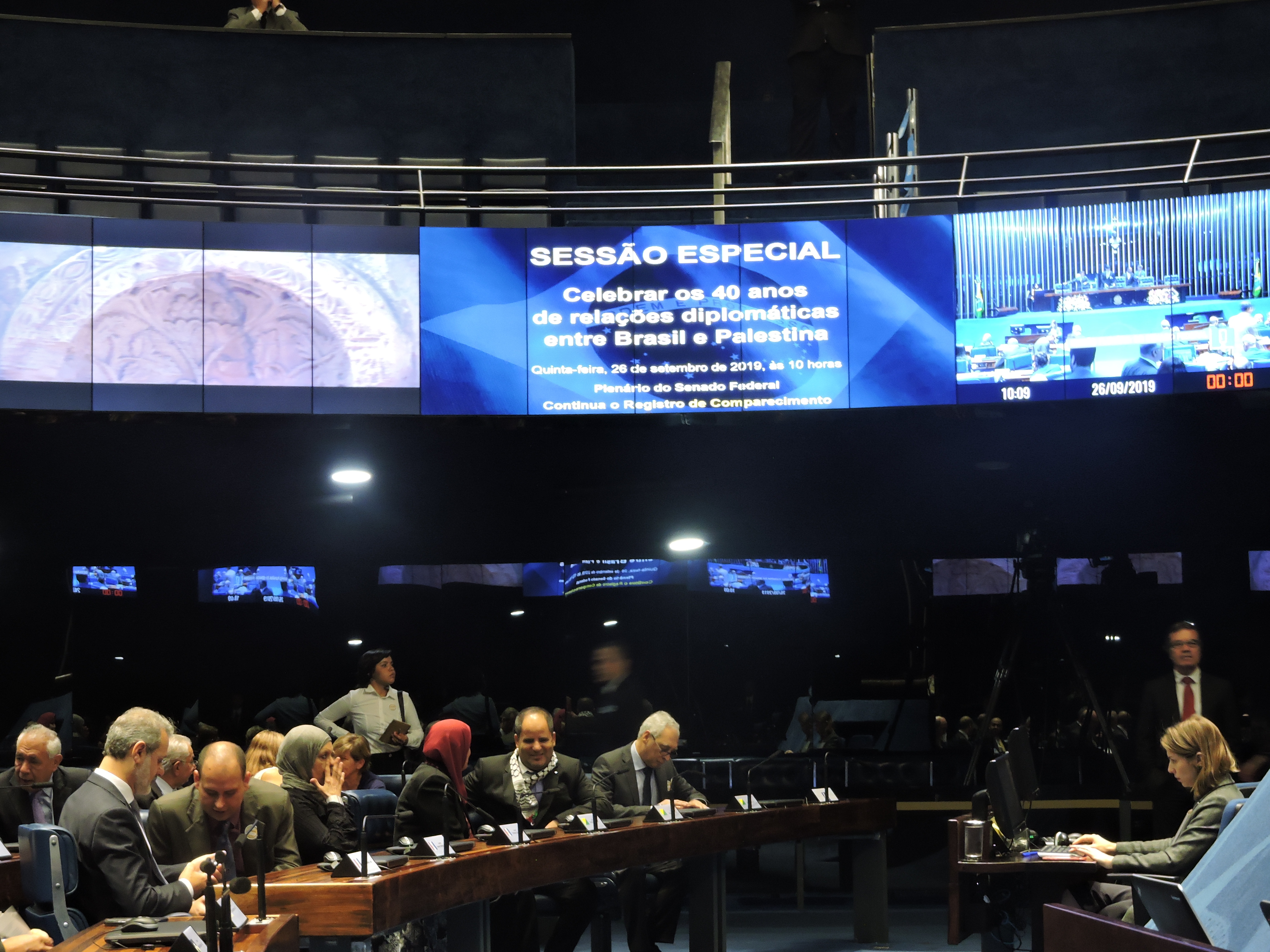 Os dois países reafirmaram suas relações de amizade ao comemorar os 40 anos de relações diplomáticas em uma Sessão Especial no Senado, na quinta-feira (26). Diversos parlamentares estiveram presente, como o presidente do Senado Davi Alcolumbre, embaixadores, membros do corpo diplomático e outras autoridades. O embaixador da Palestina, Ibrahim Mohamed Khalil Alzeben, citou que a Palestina atravessa um momento que requer esforços redobrados para, segundo ele, por fim há cinco décadas de ocupação militar israelense.
