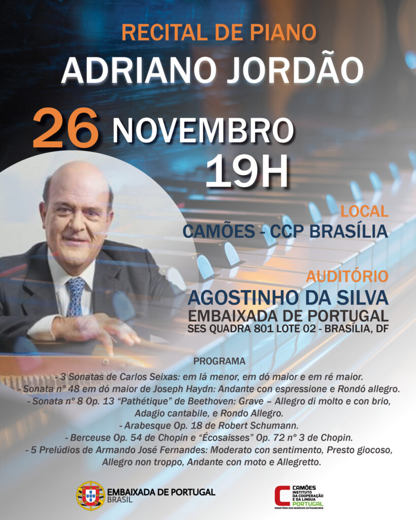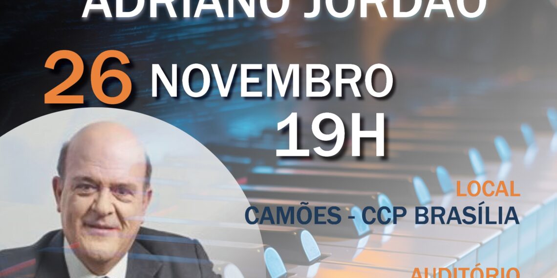 No dia 26 de novembro, às 19h, no Auditório Agostinho da Silva, na Embaixada de Portugal / Camões – Centro Cultural Português em Brasília, o consagrado pianista Adriano Jordão faz um recital especial, concebido como uma homenagem à Brasília e às amizades que marcaram sua trajetória. Com uma carreira internacional consolidada e uma ligação afetiva profunda com o Brasil, Adriano Jordão celebra, através da música, os laços culturais e humanos que construiu ao longo dos anos.