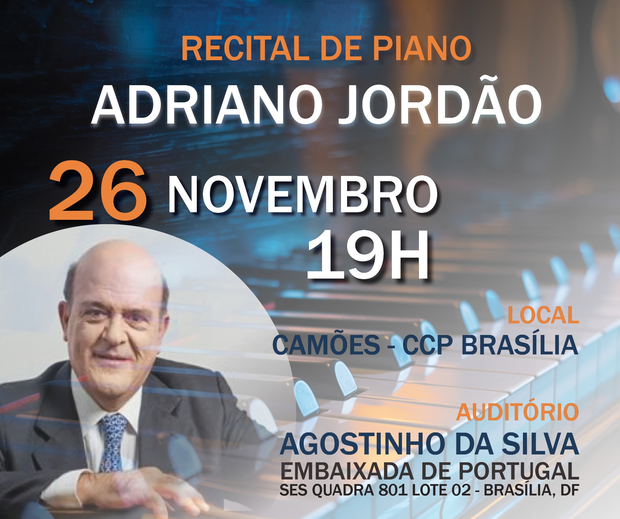 No dia 26 de novembro, às 19h, no Auditório Agostinho da Silva, na Embaixada de Portugal / Camões – Centro Cultural Português em Brasília, o consagrado pianista Adriano Jordão faz um recital especial, concebido como uma homenagem à Brasília e às amizades que marcaram sua trajetória. Com uma carreira internacional consolidada e uma ligação afetiva profunda com o Brasil, Adriano Jordão celebra, através da música, os laços culturais e humanos que construiu ao longo dos anos.