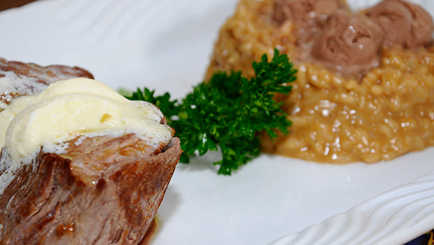 Fraldinha cozida lentamente ao molho de extrato de funghi porcini, acompanhada de fettuccine no próprio molho.