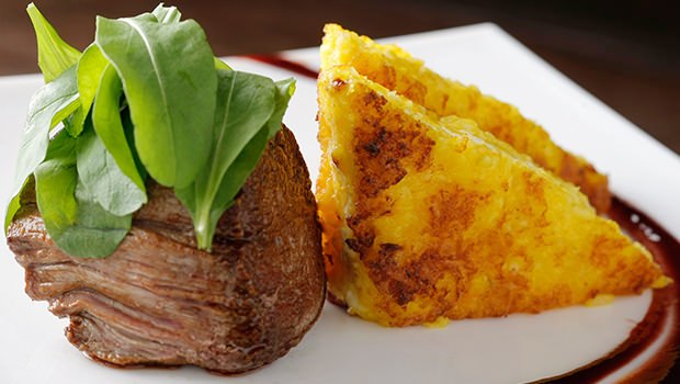 Lombo de bacalhau grelhado com molho de alho e cebola assados, regado noazeite com raspa de limão, acompanhado de purê de batata baroa e espinafre.