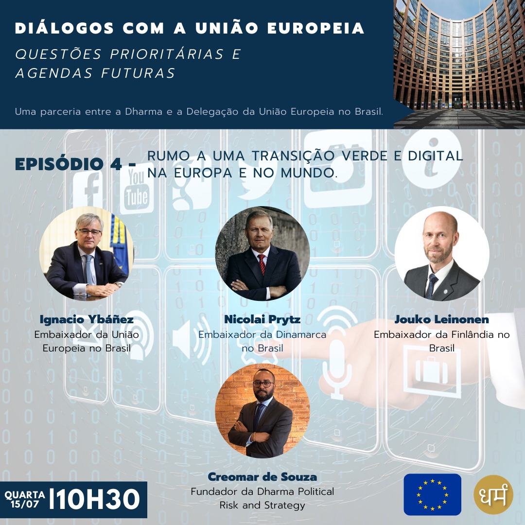 Neste quarto Webinar da segunda temporada o Embaixador Ignacio Ybáñez na qualidade de anfitrião e o CEO da Dharma, Creomar de Souza na função de moderador, dialogarão com representantes da Embaixadas da Dinamarca e da Finlândia, sobre os desafios de uma transição verde e digital na Europa e no mundo.