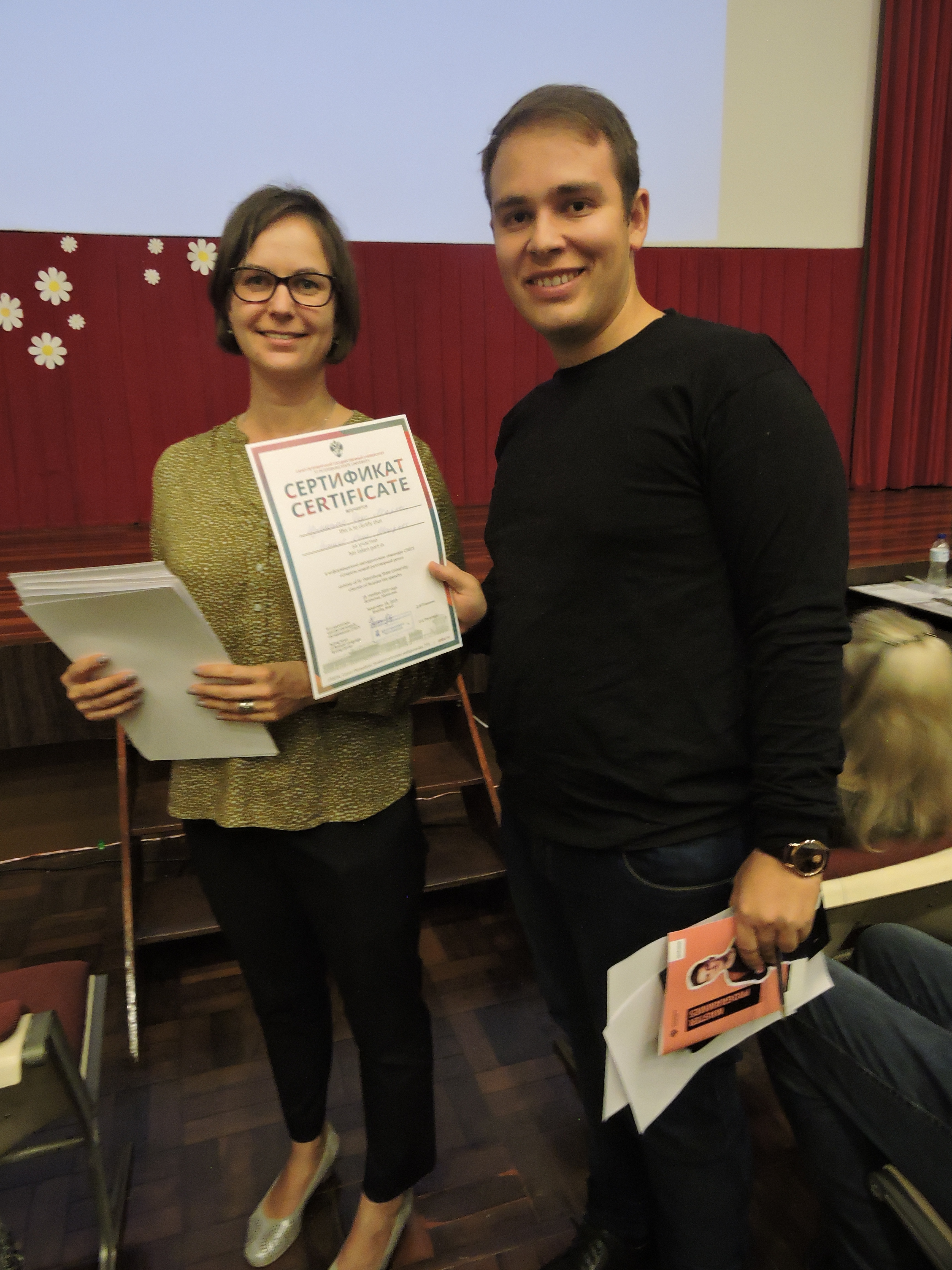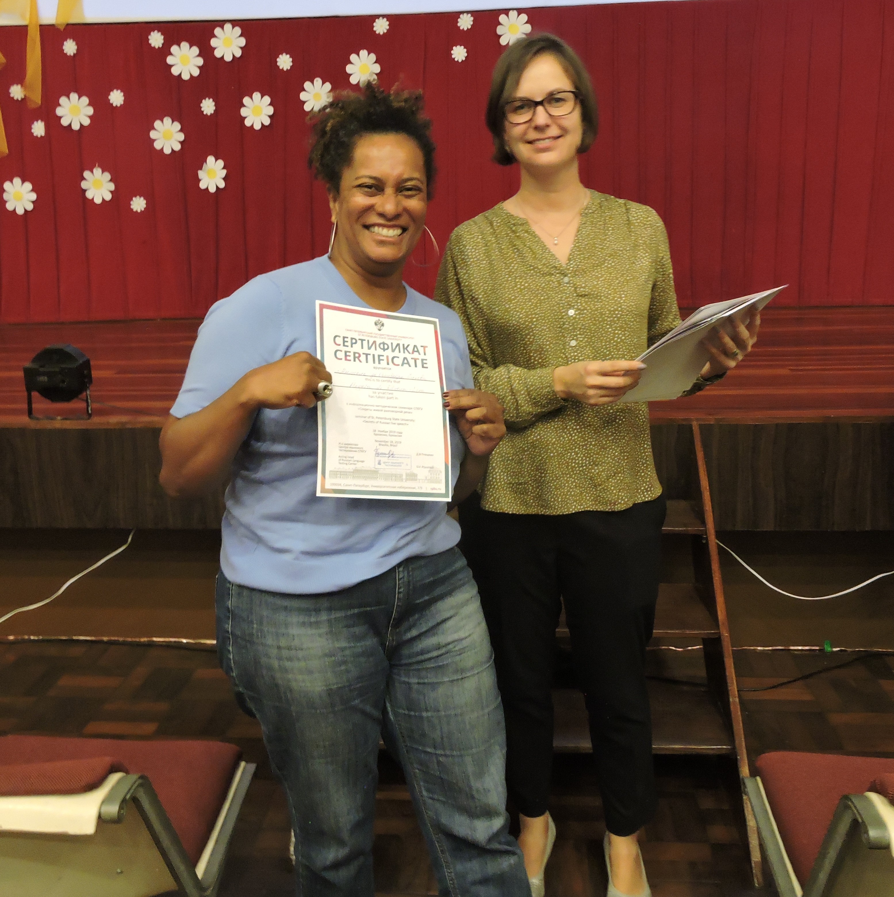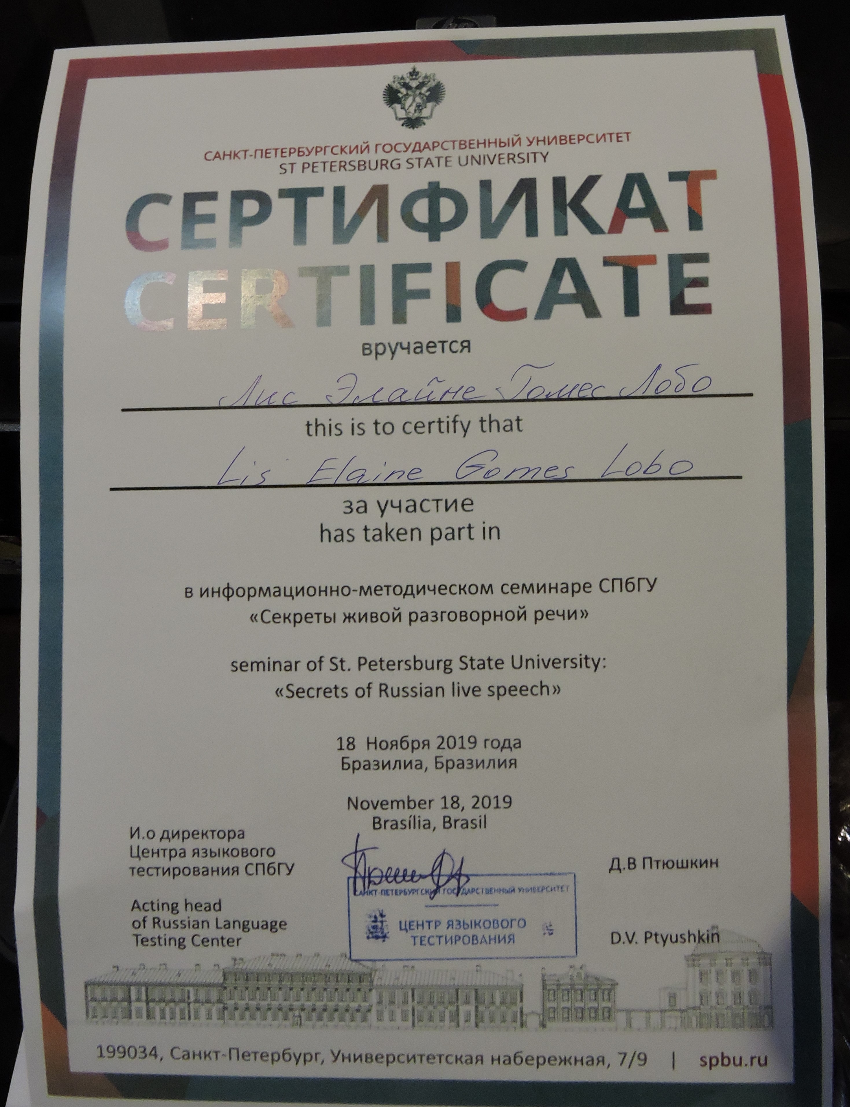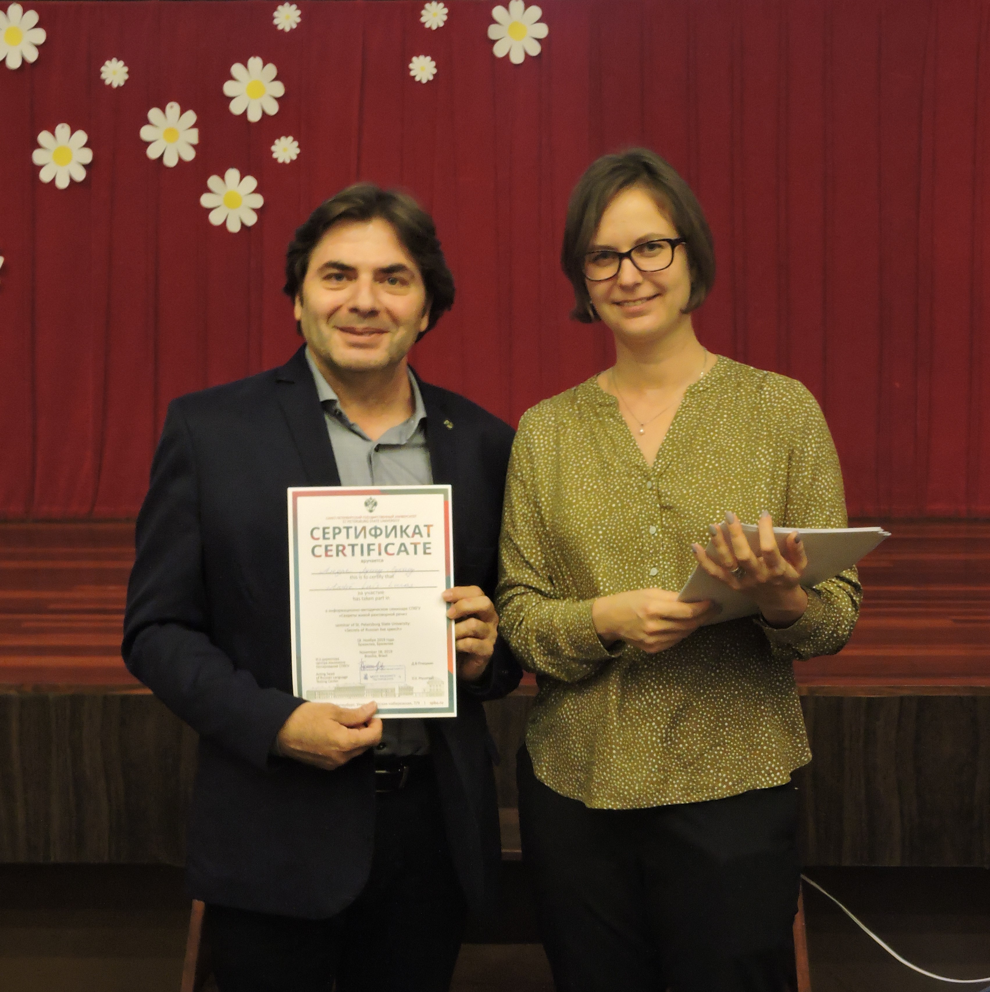 Receberam o certificado dez professores e quarenta alunos brasileiros das duas escolas que participaram da organização do teste, Yu Idiomas e Ontoletras, e também vários alunos de professores independentes e autodidatas. Nadezhda Dubinina, aplicadora do teste de proficiência da Universidade de São Petersburgo, realizou um seminário com os diplomados. Depois, todos receberam certificados de participação nos eventos da Universidade de São Petersburgo.