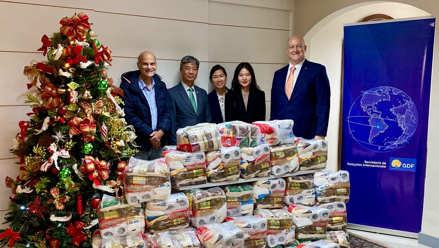 O embaixador da Coreia do Sul no Brasil, Choi Yeong Han, entregou, na tarde desta quarta-feira (10), cestas básicas arrecadadas pelos funcionários da embaixada para secretário de Relações Internacionais, Paco Britto, recebeu, para a entrega de. A doação aconteceu na sede da Serinter, Secretaria de Relações Internacionais do Governo do Distrito Federal, no Lago Sul.
