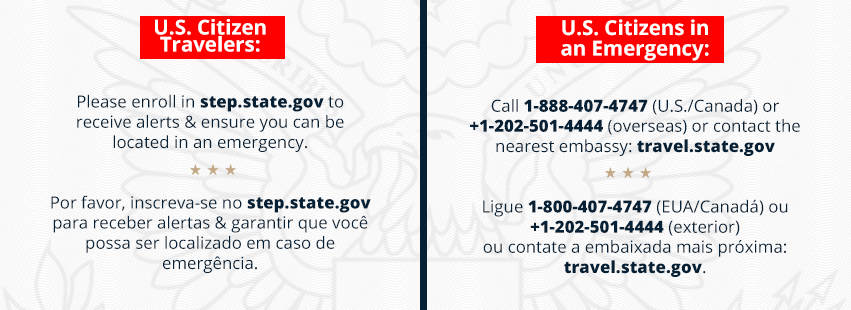 Se você é cidadão dos EUA em viagem pelo Brasil, não se esqueça de se cadastrar no site do STEP step.state.gov para receber a melhor assistência da Embaixada e dos Consulados dos EUA no Brasil, em caso de emergência.