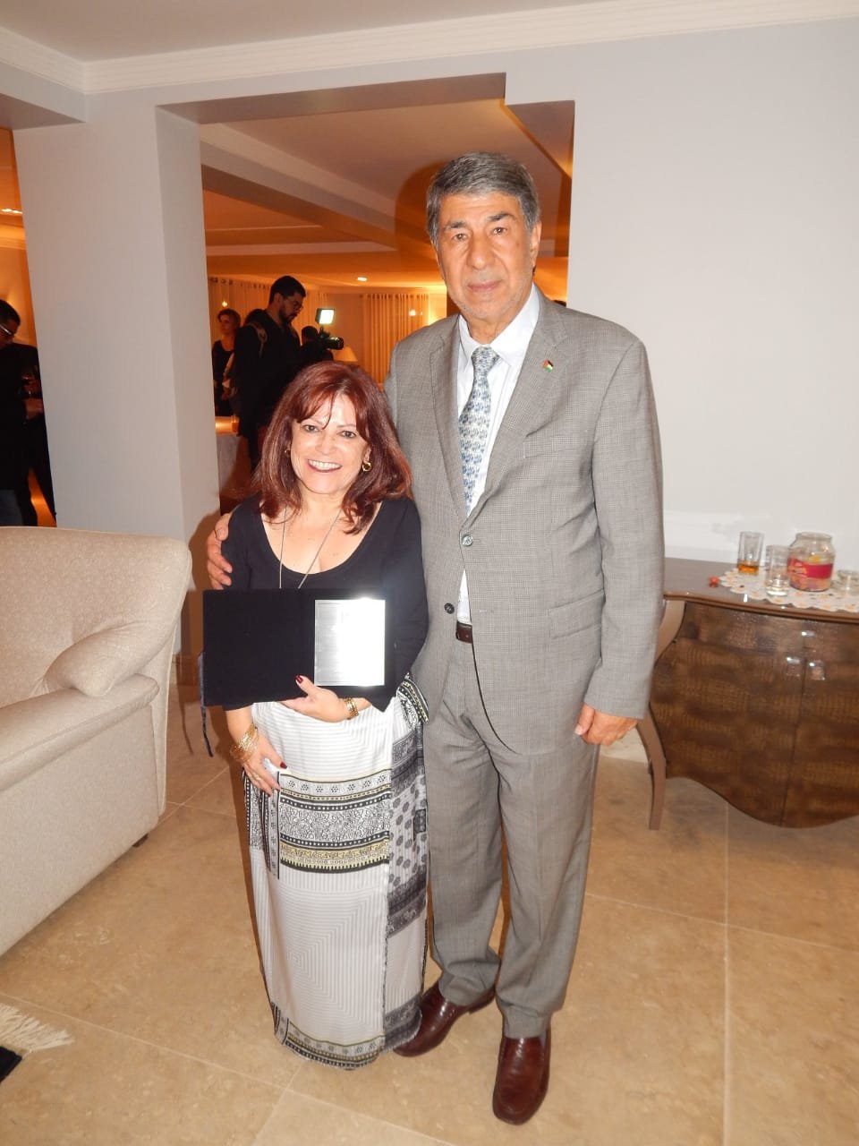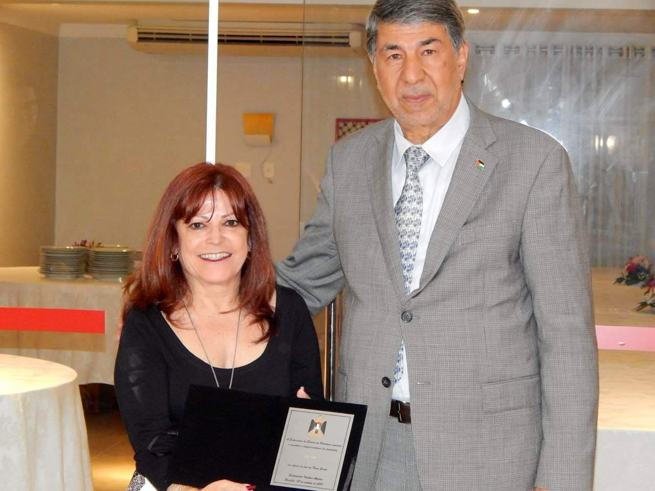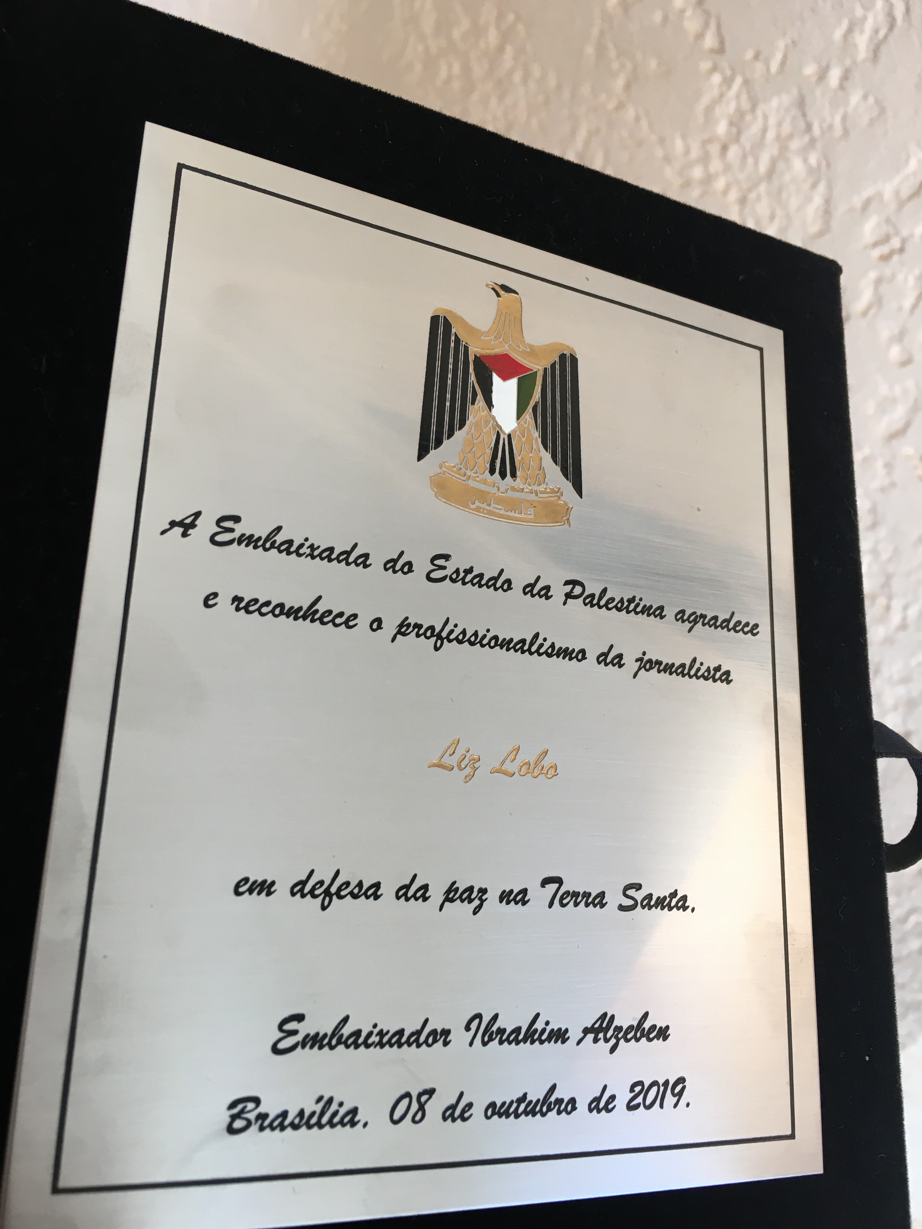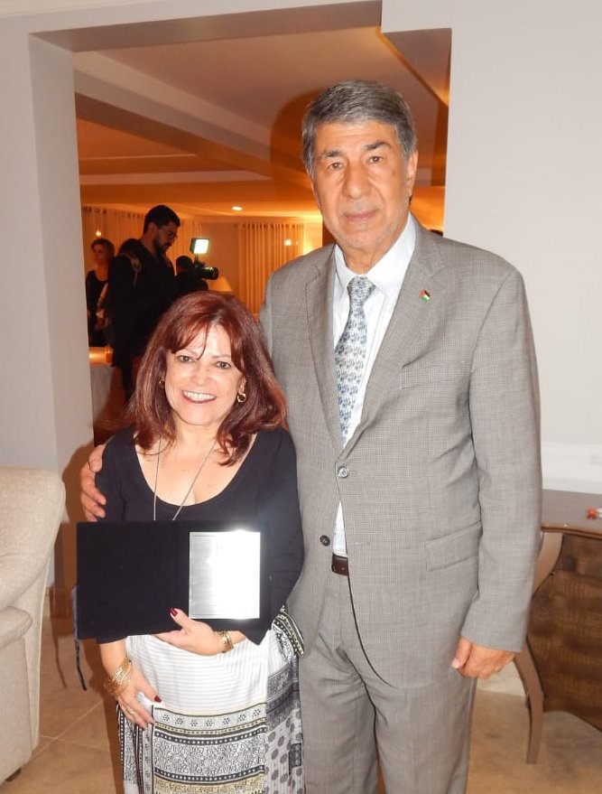 A diretora da revista Embassy, Liz Elaine Lôbo foi uma das jornalistas que receberam a premiação das mãos do diplomata palestino. Ao todo, quinze profissionais foram homenageados, na terça-feira (08), na residência oficial, com uma placa em que o Estado da Palestina agradece e reconhece o trabalho em defesa da Terra Santa. Al Zeben destacou o caráter imprescindível da imprensa na promoção da paz e da causa palestina.