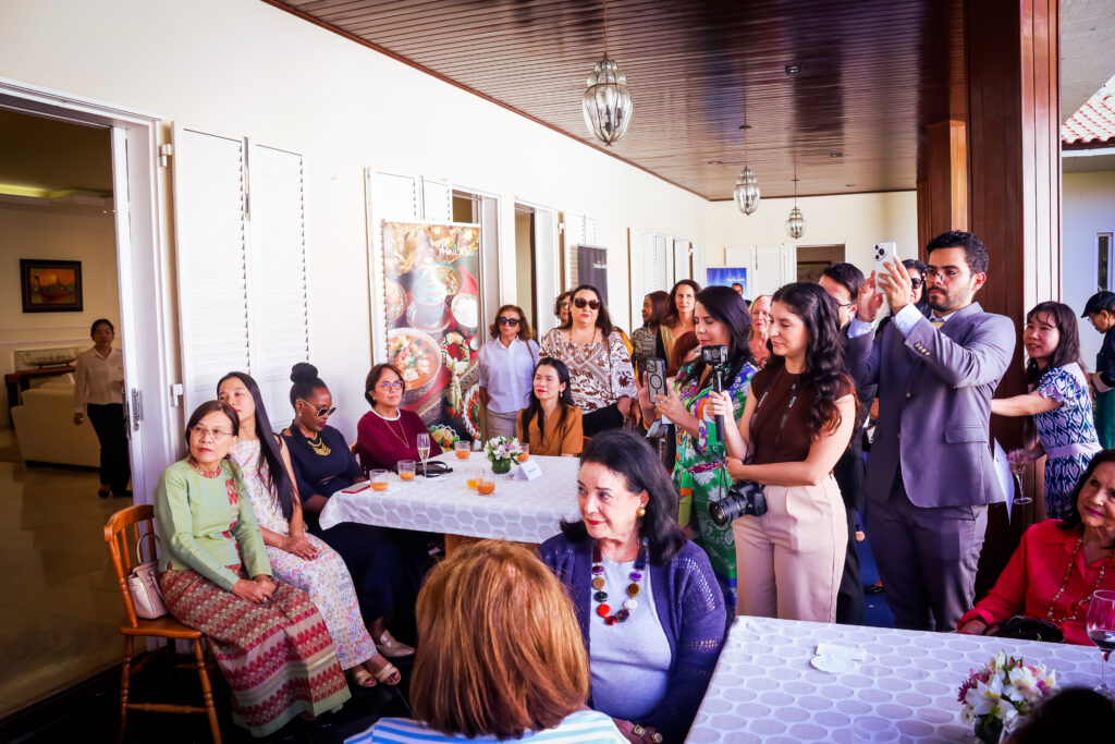 A programação da tarde repleta de sabores, aromas e aprendizados contou com a presença de diversas embaixadoras, embaixatrizes e representantes do corpo diplomático, que, ao lado das associadas do CIB, participaram ativamente da aula e da degustação das iguarias preparadas. O Chor Muang, considerado um prato histórico da realeza tailandesa, encantou os participantes com sua apresentação artística — moldado em forma de flor e tingido naturalmente com o azul-índigo da flor Anchan (ervilha-borboleta). A atividade promoveu uma verdadeira imersão na cultura tailandesa por meio da gastronomia, revelando a sofisticação e a diversidade de sabores que tornam a culinária do país um patrimônio cultural reconhecido internacionalmente.