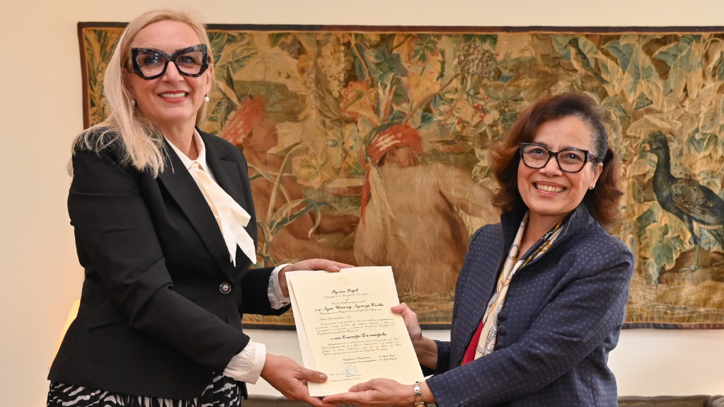 Embaixadora Maria Laura da Rocha recebe o documento dos dois novos chefes de missão, Marwan Jebril Burini e Eleonora Dimitrova Dimitrova