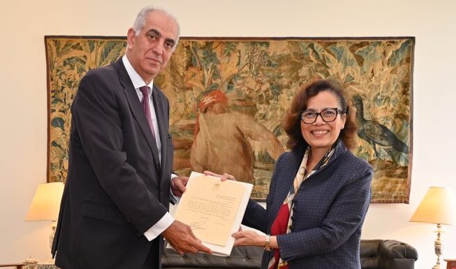 Embaixadora Maria Laura da Rocha recebe o documento dos dois novos chefes de missão, Marwan Jebril Burini e Eleonora Dimitrova Dimitrova