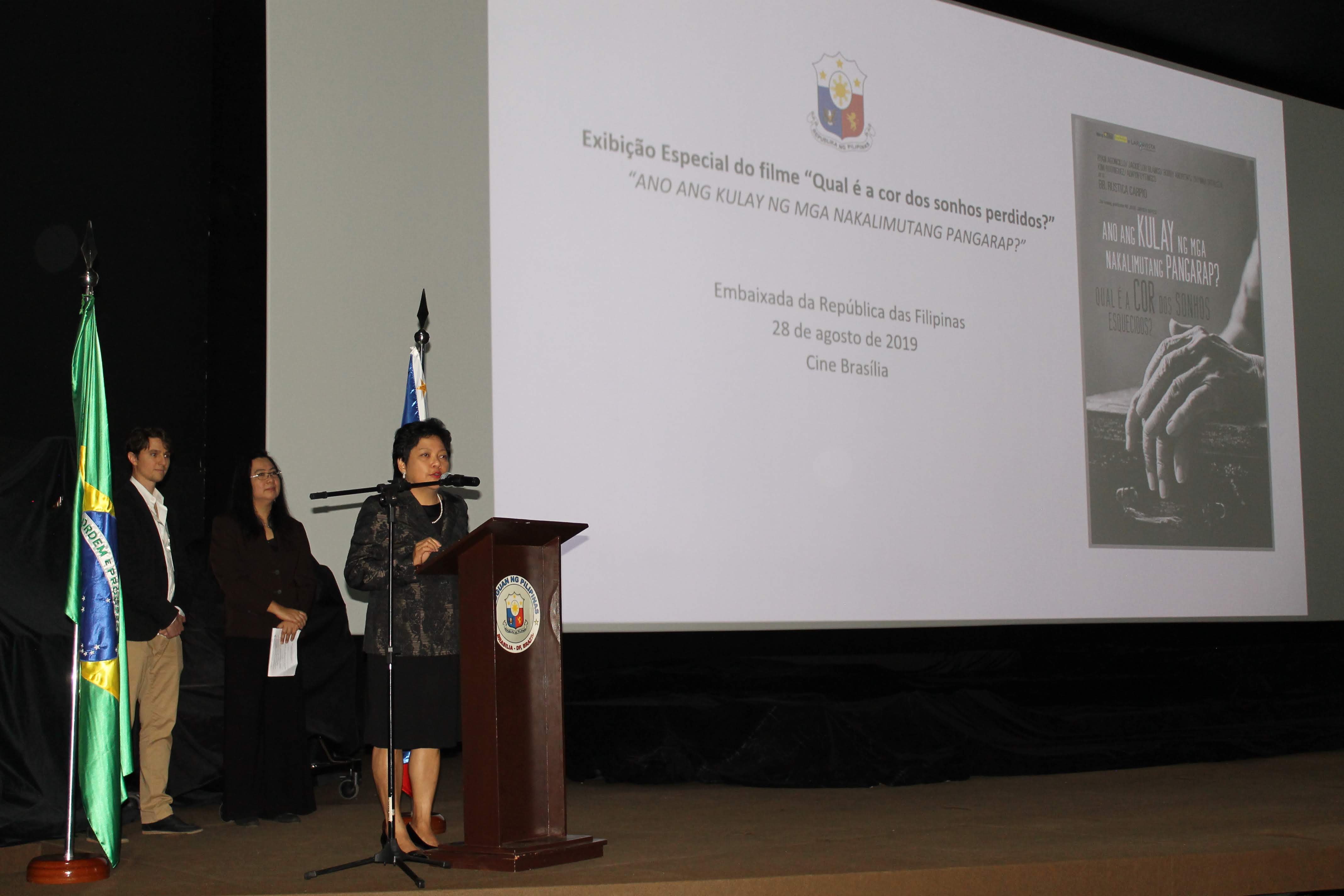 A embaixadora filipina, Marichu Mauro, prestigiou o evento, e se dirigiu aos estudantes em português ao agradecer pela lotação da sala de cinema. A líder diplomática também ressaltou a importância de estreitar relações culturais com a (Secec), para continuar promovendo ações conjuntas para a população do Distrito Federal. “Esperamos que seja o início de uma cooperação junto à Secretaria de Cultura e Economia Criativa do Distrito Federal. Estamos muito felizes por lotar a sala de estudantes”, celebrou.