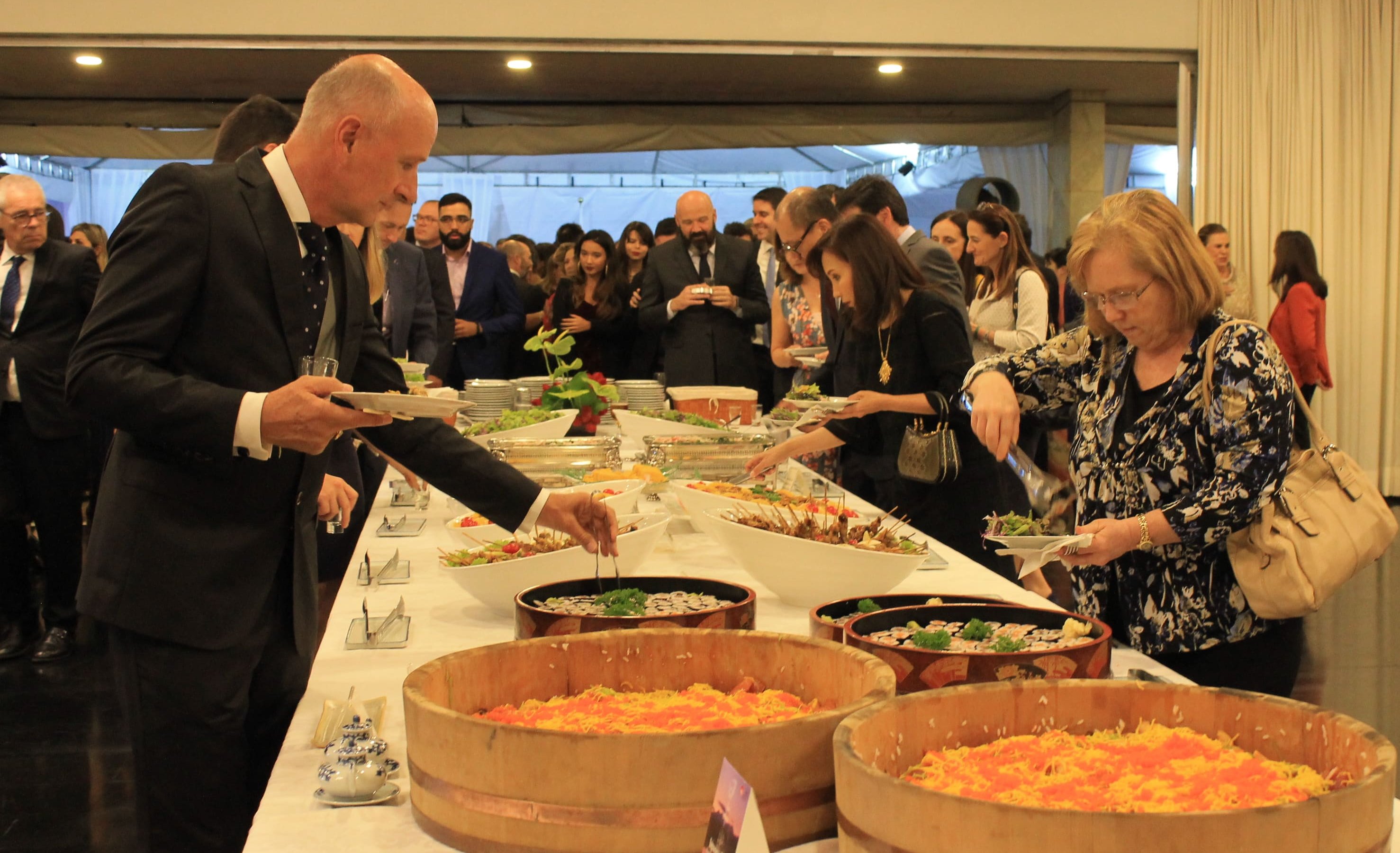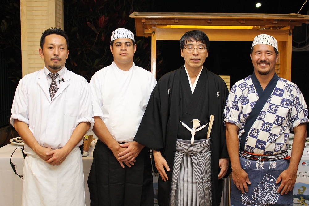 Gastronomia – Os presentes ao evento puderam saborear um jantar de cardápio típico japonês, completo com tempurá, tonjiru (sopa com carne de porco e legumes) e sushi preparado na hora pelo chef Cristiano Komiya, do restaurante New Koto. O buffet foi coordenado pelo chef da residência oficial, Kazumine Nohara.