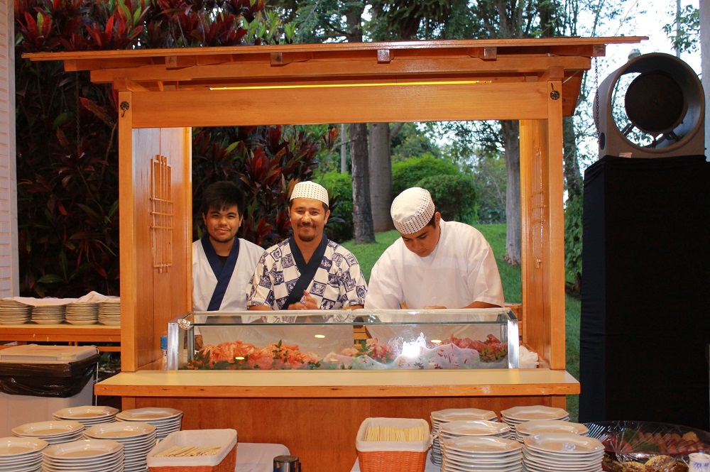 Gastronomia – Os presentes ao evento puderam saborear um jantar de cardápio típico japonês, completo com tempurá, tonjiru (sopa com carne de porco e legumes) e sushi preparado na hora pelo chef Cristiano Komiya, do restaurante New Koto. O buffet foi coordenado pelo chef da residência oficial, Kazumine Nohara.