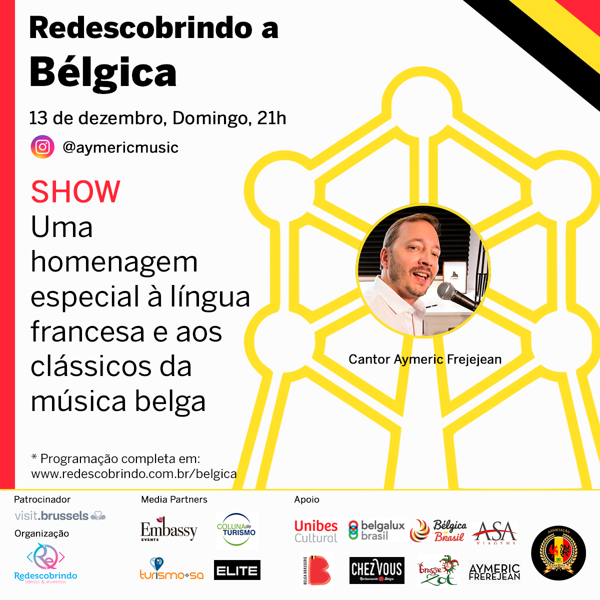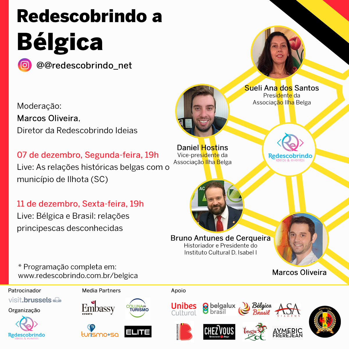Constam no calendário do Redescobrindo a Bélgica dois webinários em parceria com a Unibes Cultural (06 e 13/12 às 14h); um webinário sobre turismo com a Elite Magazine (10/12, às 12h); três lives com o blog Um Luxo de Viagem em 10/12 (13h, 15h e 17h); um show especial com o cantor francês Aymeric Frerejean (no domingo 13/12), entre outras ações que podem ser encontradas no site www.redescobrindo.com.br/belgica. Cada evento da agenda é coordenado diretamente pela entidade em parceria com o curador.