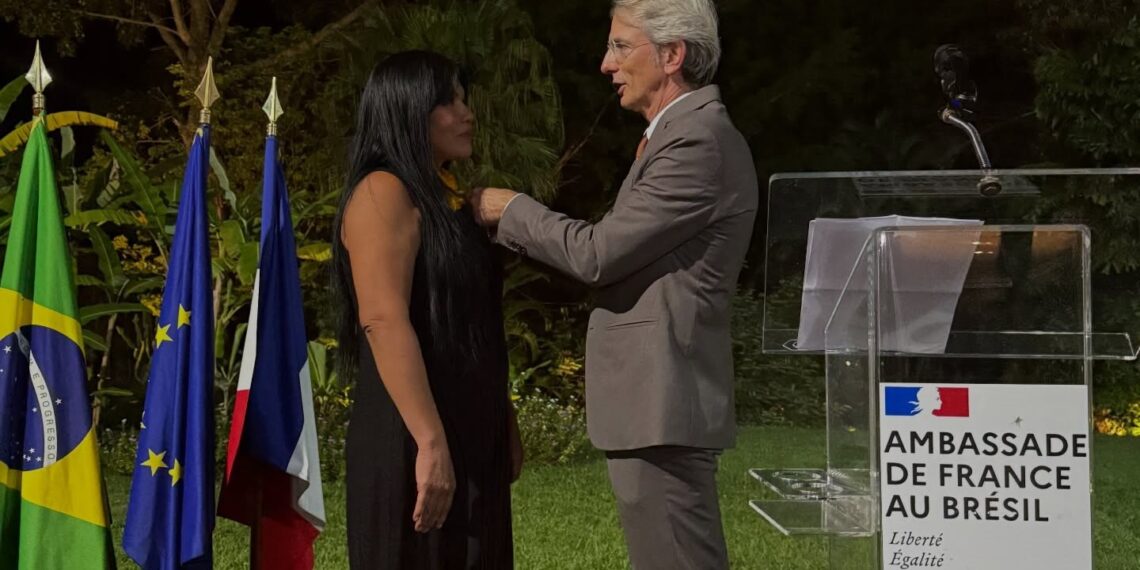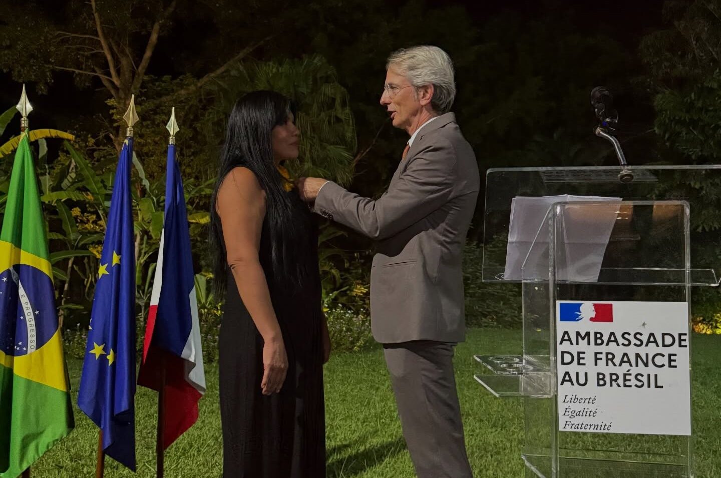 Celebrando a trajetória inspiradora, o embaixador da França no Brasil, Emmanuel Lenain, concedeu, nesta terça-feira (07), à líder indígena Watatakalu Yawalapiti a Ordem Nacional do Mérito. Com a condecoração, a França reconhece seu compromisso exemplar e reforça sua parceria com o Brasil em prol da bioeconomia e da proteção da Amazônia. A homenagem foi na sede da embaixada, em Brasilia.