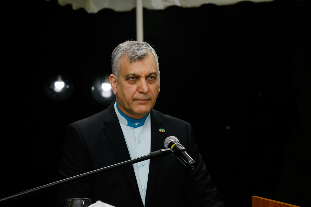 O Embaixador Seyed Ali Saghaeyan aproveitou seu discurso para fazer um pequeno balanço das relações comerciais entre seu país e o Brasil. Ele disse esperar que as relações históricas e harmônicas bilaterais continuassem como no passado, ”baseadas no respeito mútuo e interesses comuns dos dois povos”. Saghaeyan destacou a consolidação da base do sistema de governo iraniano e garantiu que o país também avançou notadamente nas áreas econômicas, industriais, tecnológicas e científicas.
