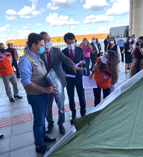 A entrega foi feita no Aeroporto Internacional de Viracopos, em Campinas (SP), onde os itens chegaram no dia 26. Participaram da cerimônia o Ministro da Cidadania, João Roma; o Coordenador Geral do Centro Nacional de Gerenciamento de Riscos e Desastres (CENAD) do Ministério de Desenvolvimento Regional, Leno Rodrigues de Queiroz; o Embaixador do Japão no Brasil, HAYASHI Teiji; e o Representante Sênior da JICA em Brasília, SATO Shinji.