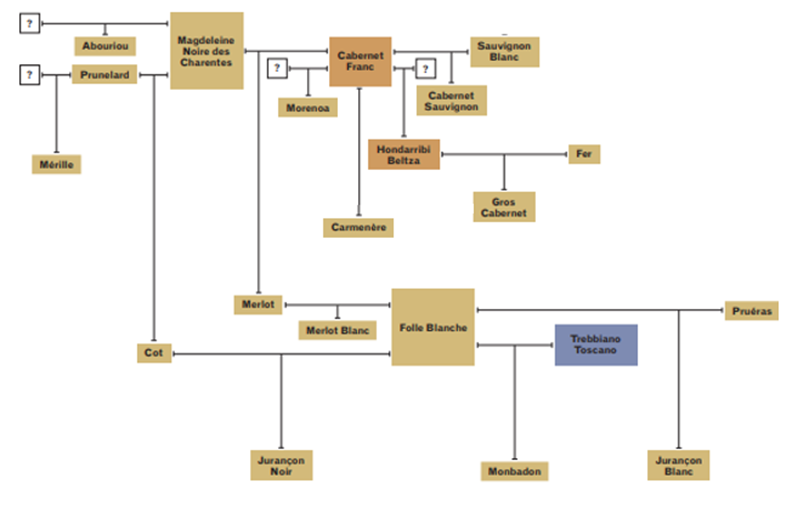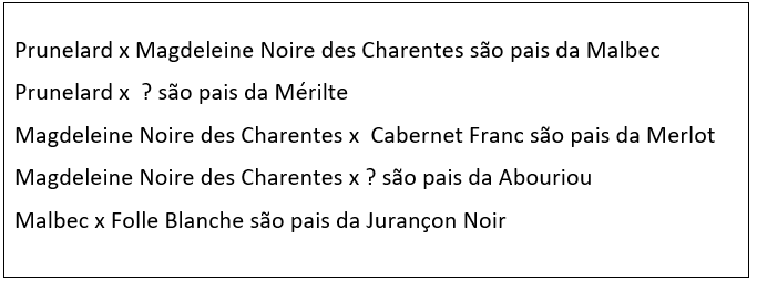 Malbec tem pedigree. Segundo a escritora Jancis Robinson no livro “Wine Grapes: A complete guide to 1,368 vine varieties”, Penguin Books Ltd., a partir de exames do DNA, a Malbec é filha da variedade Prunelard cruzada com Magdeleine Noire des Charentes. A Magdeleine Noire des Charentes em cruzamento com outra variedade ainda não identificada, são pais da Abouriou. Essa mesma variedade, a Magdeleine Noire des Charentes em cruzamento com a variedade Cabernet Franc são pais da Merlot. E, por sua vez, a variedade Prunelard cruzada com outra ainda não identificada, são pais da Mérilte. Portanto, a variedade Malbec tem como meias-irmãs as variedades Abouriou, Merlot e a Mérilte. Mas sua linhagem não pára por aí. Por sua vez, a variedade Malbec em cruzamento com a Folle Blanche são pais da Jurançon Noir. Resumindo, a variedade Malbec tem pais, meias-irmãs e filha.