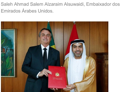 O presidente Jair Bolsonaro recebeu hoje (21) as credenciais de cinco novos embaixadores no Brasil, em cerimônia reservada no Palácio do Planalto. A partir de agora, estão habilitados a despachar no país os representantes de Chipre, Evagoras Vryonides; do Uruguai, Guillermo Valles Galmés; do Paquistão, Ahmad Hussain Dayo; da Índia, Suresh K. Reddy; e dos Emirados Árabes Unidos, Saleh Ahmad Salem Alzaraim Al-Suwaidi.