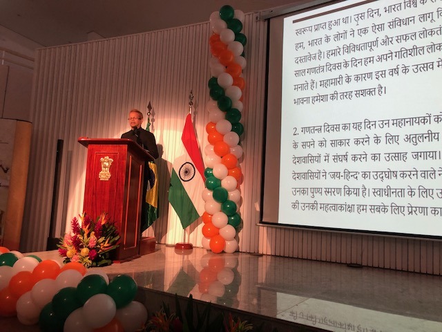A Índia comemora hoje (26) o Dia da República, que celebra a promulgação em 1950 da Constituição nacional, a mais longa do mundo, com 444 artigos, que substituiu a lei colonial britânica, em 26 de janeiro de 1950. A Índia ganhou a independência do domínio colonial britânico em 1947.O Ministro Baisnab Pradhan comandou o evento que começou com o hasteamento da bandeira e a execução do hino nacional da Índia no jardim da sede diplomática. Em seguida, ele leu o discurso otimista proferido pelo Presidente da Índia Shri Ram Nath Kovind, por ocasião do 73º aniversário do dia da República.