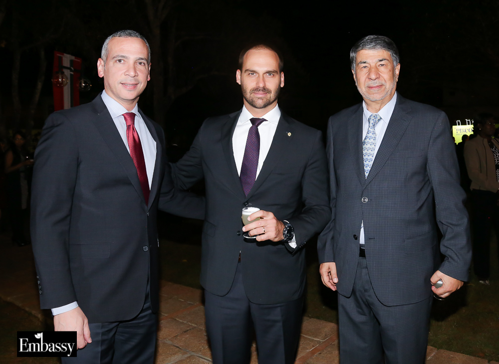 A noite da última quinta-feira (08), foi de festa para a comunidade peruana em Brasília. Nos jardins da sede diplomática do Peru, o embaixador Javier Yépez recebeu seus convidados com o melhor da cozinha do país. Entre os presentes estava o deputado Eduardo Bolsonaro, além de jornalistas, amigos e convidados.