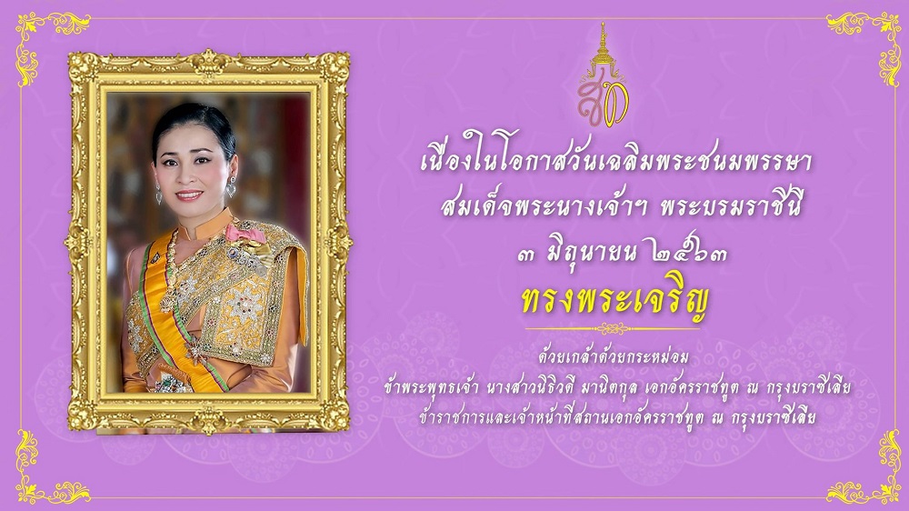 Servidores da sede diplomática realizaram hoje (03) uma solenidade mostrando a lealdade deles à Alteza Real Suthida Tidjai e promoveram a entrega de doações para famílias carentes do Distrito Federal. A celebração começou com a embaixadora Nitivadee Manitkul depositando flores em frente a imagem da rainha e depois leu uma mensagem dela. Depois, todos enviaram uma mensagem a Alteza Real