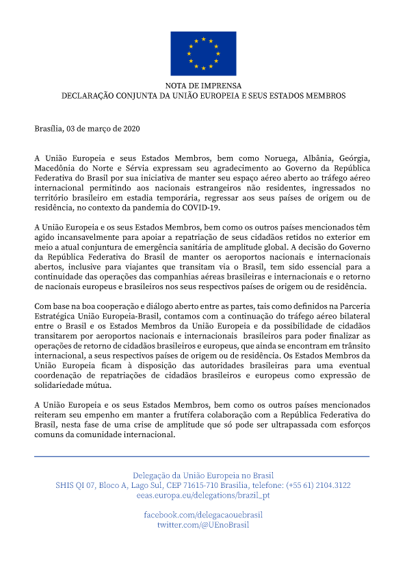 A União Europeia e seus Estados Membros, bem como Noruega, Albânia, Geórgia, Macedônia do Norte e Sérvia expressam seu agradecimento ao Governo da República Federativa do Brasil Governo do Brasil por sua iniciativa de manter seu espaço aéreo aberto ao tráfego aéreo internacional