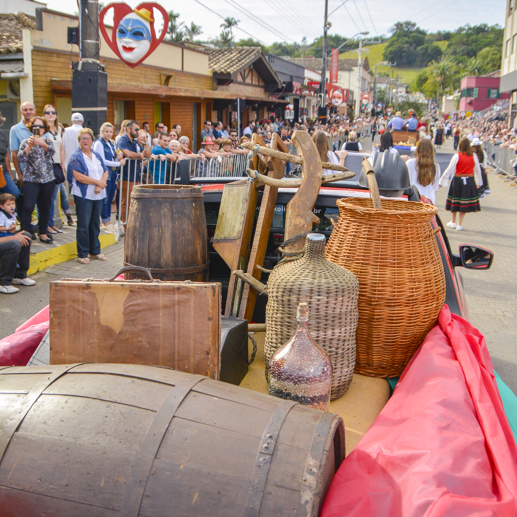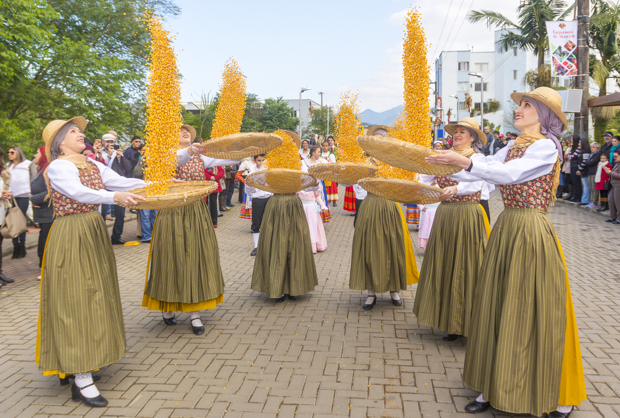 Com trajes e máscaras coloridas, os personagens se divertem dançando em meio ao público da festa, ao som das tradicionais marchinhas traduzidas para o italiano. São mais de 500 personagens que desfilam em blocos temáticos e carros alegóricos. E o mais interessante todos os trajes e máscaras são produzidas na cidade.
