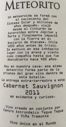 Envolvido com vinhos e astronomia desde sempre, o vitiviniculor britânico Ian Hutcheon combinou as duas paixões ao elaborar o vinho extraterrestre cujo nome é “Vinho Meteorito Cabernet Sauvignon” da parceria da Viña Tremonte Boutique Vineyard com o Centro Astronômico de Tagua Tagua em San Vicente/Chile, da variedade Cabernet Sauvignon produzida por ele mesmo, usando a viticultura biodinâmica.